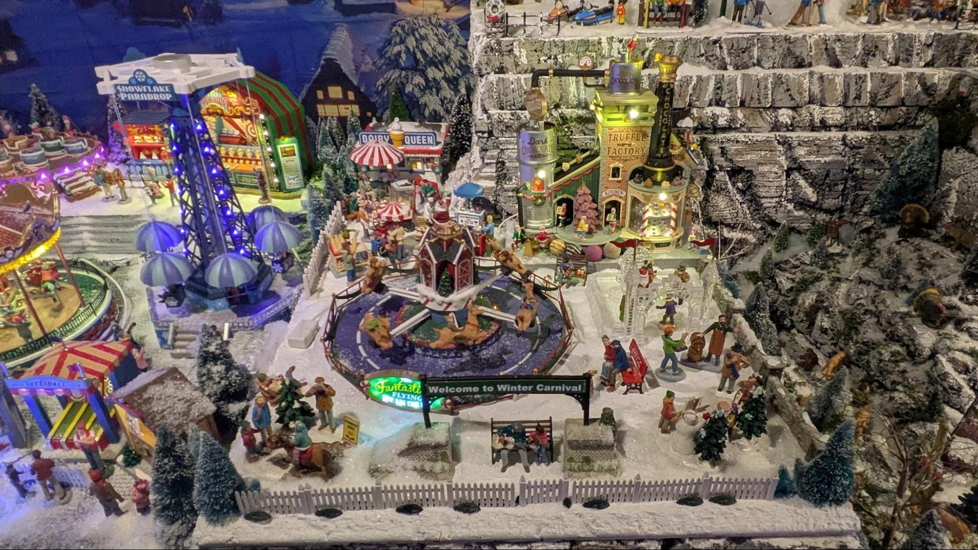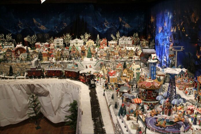 The exhibit features a model “Christmas Village,” complete with a miniature Stockbridge Main Street, with a model train winding its way through the village.