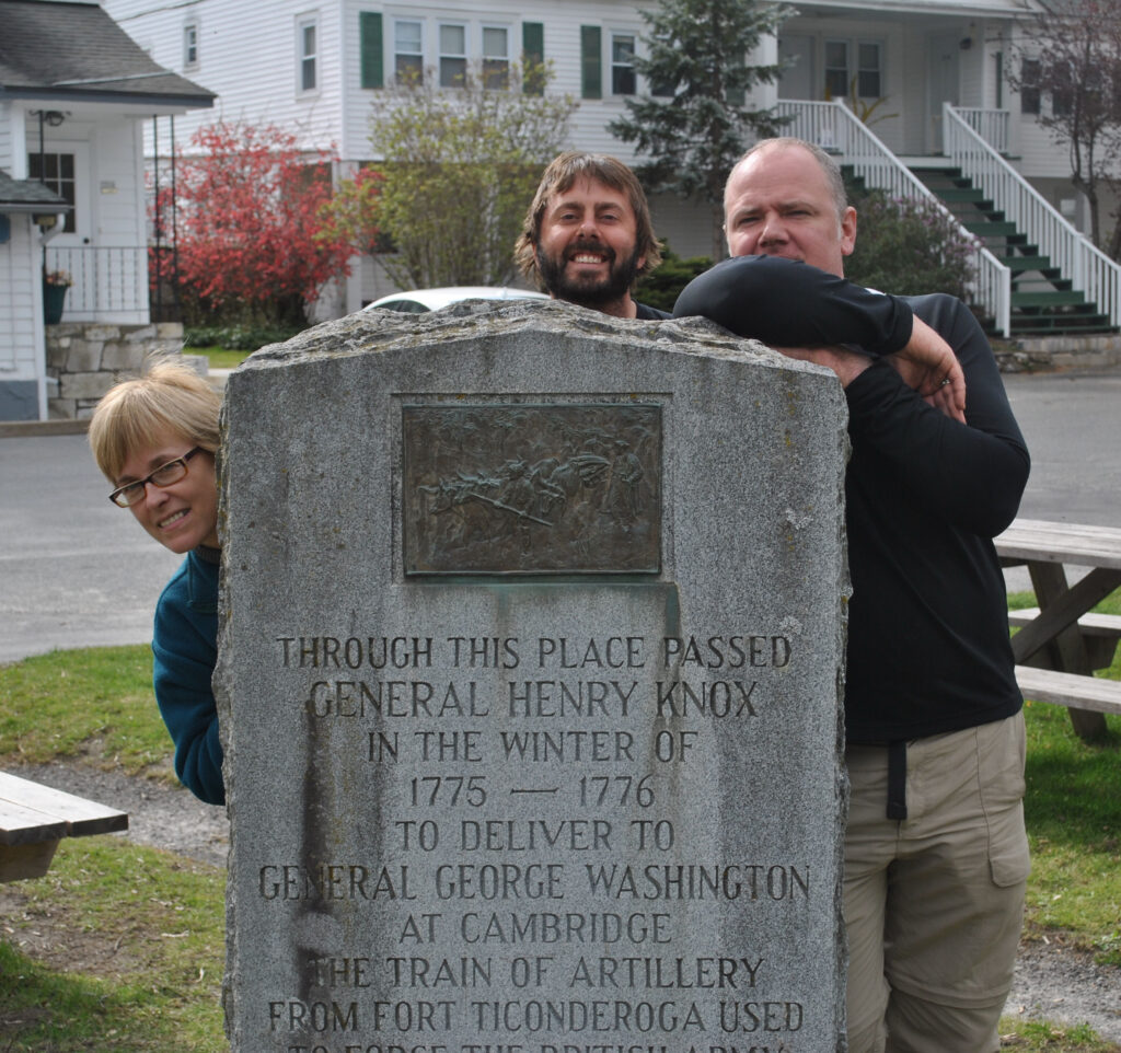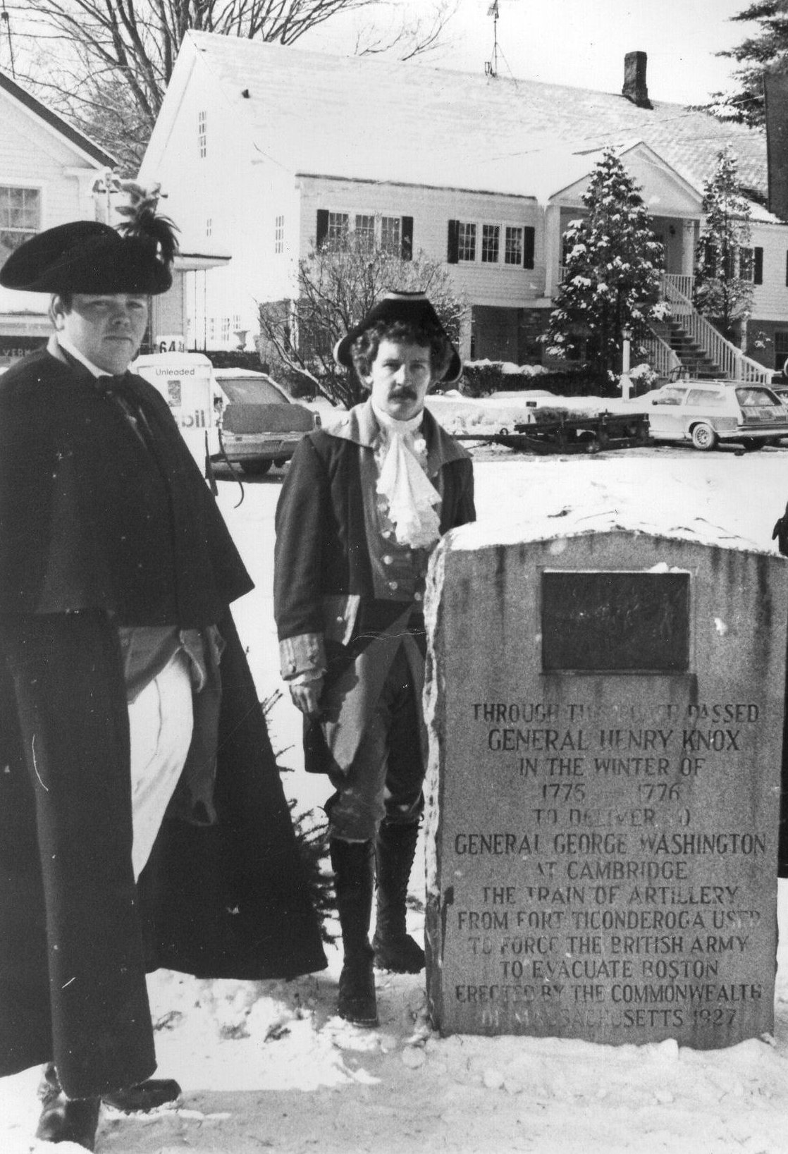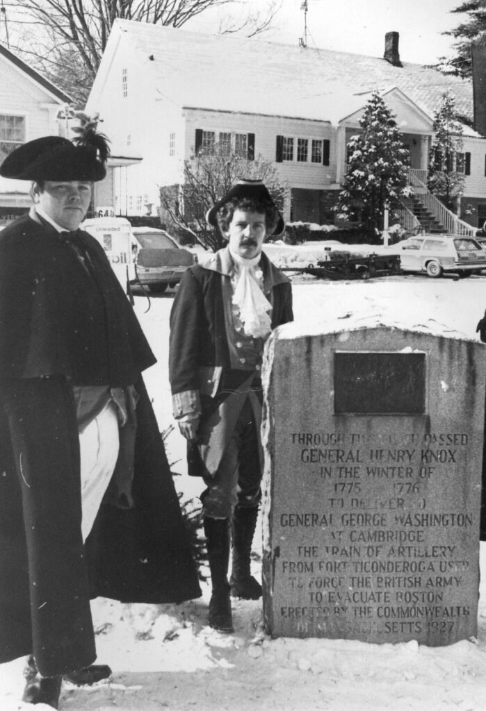 Granite markers were installed, each with a bronze tablet featuring a simplified map of the trail and a dramatic bas-relief image of cannons on sleds being dragged by oxen. Included were the words: “Through this place passed General Henry Knox in the winter of 1775 – 1776 to deliver to General George Washington at Cambridge the Train of Artillery from Fort Ticonderoga used to force the British army to evacuate Boston.”