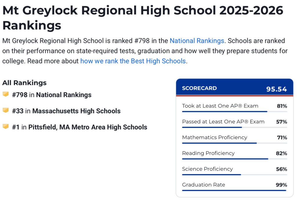 Just compare it to Mt. Greylock Regional High School (MGRHS), which is rated much higher.