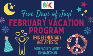 From February 16th through the 20th, Berkshire Art Center, located at 13 Willard Hill Road in Stockbridge, presents “Five Days of JOY!”, vibrant, hands-on art experiences for children ages six and up. Designed to spark imagination and celebrate creativity, Five Days of JOY! invites young artists on a weeklong adventure exploring light, self-expression, collaboration, and celebration through a wide variety of themed art-making experiences. Themes include “The Joy of Me,” “Painting Light,” “Sun, Moon, and Starlight,” “Bring in the Light,” and “Joy to the World.”