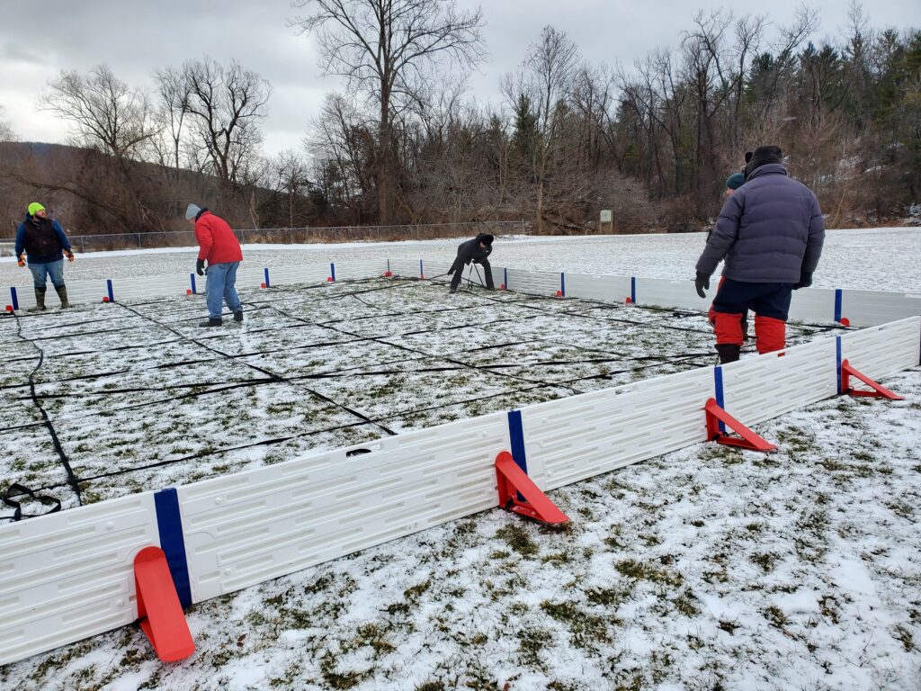 Volunteers assemble the jigsaw-puzzle-like ice skating rink at the Lee Athletic Fields. Photo by Kathy Hall.