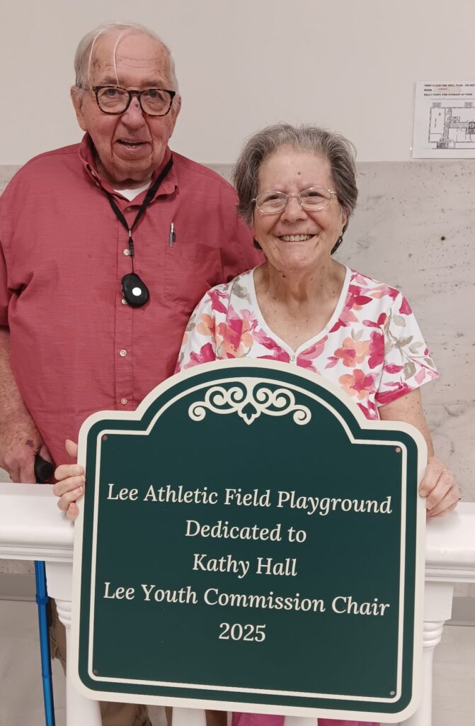 The Lee Select Board presented her with a plaque at their bi-monthly meeting, dedicating the Lee Athletic Field Playground to Hall and noting that she was a founding member of the Lee Youth Commission, served as chairperson of the commission for over 10 years, and made numerous contributions to both the town and the commission for years.