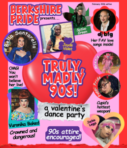 On Friday, February 13th at 8 p.m., Berkshire Pride presents “TRULY MADLY 90’s,” a Valentine’s Day dance party for the LGBTQ+ community and allies at the Stationery Factory, located at 63 Flansburg Avenue in Dalton. Expect a night full of dancing, connection, and queer joy — plus drag performances from beloved Berkshire favorites. You’re invited to fall in love on the dance floor with DJ BFG spinning slow jams, pop divas, and all your favorite 90’s throwbacks. Come dressed in your best 90’s look, or don’t. Whether you’re rolling deep with friends, dancing solo, or showing up with your sweetheart, this is a space to be exactly who you are.