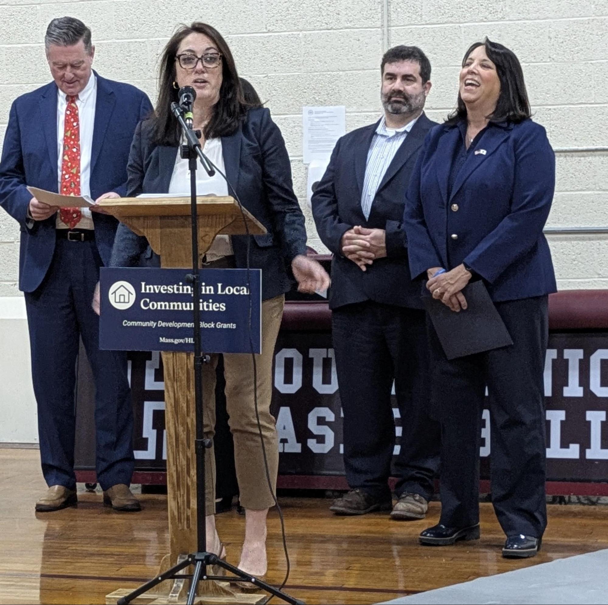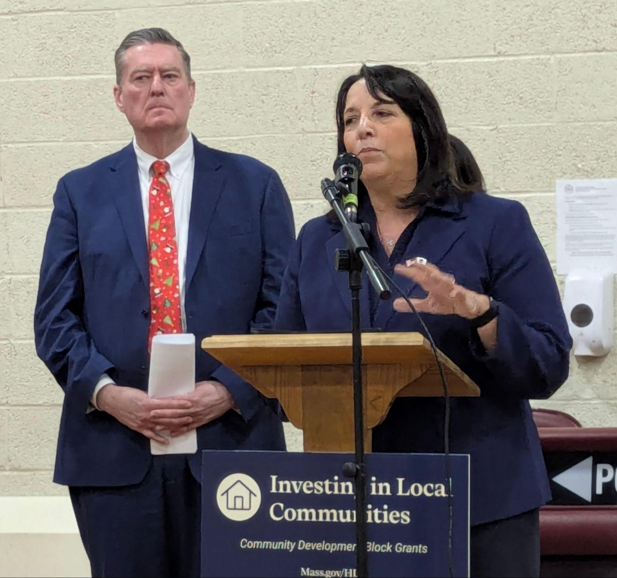 “I know we’ve got local officials from throughout the Commonwealth here, and many right here from nearby in the region, and I’m really grateful for the work you do every single day to uplift and empower a high-quality life in Massachusetts,” Lt. Gov. Driscoll told the audience towards the beginning of her speech. “[Secretary Augustus and I] have our roots in local government. We really recognize the importance of having strong local partners who are doing hard work every day, educating our kids, keeping our neighborhoods safe, and investing in the best of what makes our communities special. These are places where we make memories, and places that drive the economy. These dollars in particular can help do all of that, along with helping cure older housing stock and meet needs of community members who might find a desire to have a new roof or make a housing unit more accessible but don’t always have the resources to do it. These dollars are really special, and we’re really grateful.”