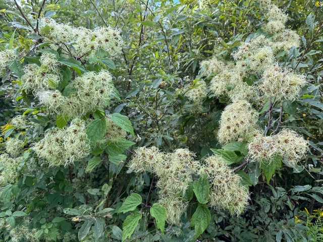 Prolific along country roads and suitable, with oversight, in the polyculture garden, native Virgin’s Bower (Clematis virginiana) bears attractive small white flowers followed by the seed heads, shown here.