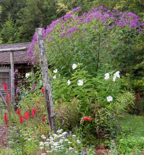 The rich soil of the garden bed holds moisture, supporting these native plants found in the wild bordering lakes and ponds. Garlic chives (Alium tuberosum), growing to 24 inches in the center foreground, is of Asian origin. Its interest is aesthetic and culinary.
