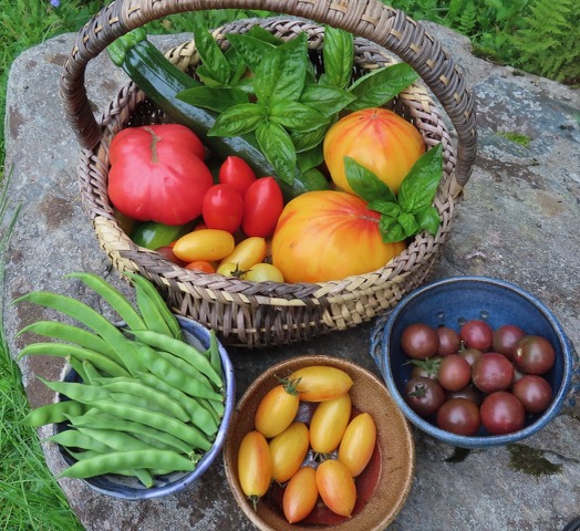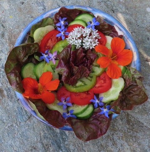 Composing a salad in a hand-thrown and -painted, footed bowl is a treat for the composer and the recipient alike. The blossoms are: spicy nasturtium, mild borage, and pleasant garlic chive in its umbel. The garlic chive florets are best pulled out of the umbel and sprinkled about. Notice the yellow-painted skin of the Green Zebra tomato. It is a full-flavored, ripe tomato.