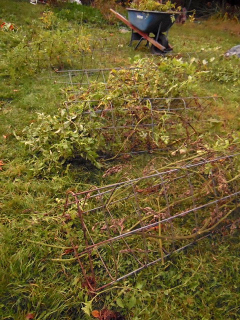 Mount Washington — The sun is rising, but it will be hours before our low-arcing star climbs above the trees to the east-southeast to light my garden. Here’s today’s line-up of turn-of-the-season tasks. First, pick all the remaining green beans off bamboo poles and trellises, then cut bean vines at ground level and pull up poles with the twining, three-leaflet leaves hanging on. Remove to staging area to be cleaned before stowing. Cut dried cornstalks–also supporting bean vines–level with the ground; break in half or thirds and pile into wheelbarrow. Gather up remaining delicata and Styrean pumpkin. Rake the bed to its full form. Uproot weeds. Spread two inches of compost over the cleared ground. Aerate with fork, rake again, broadcast annual winter rye grains thickly and cover seed with thin layer of earth. Shower generously.