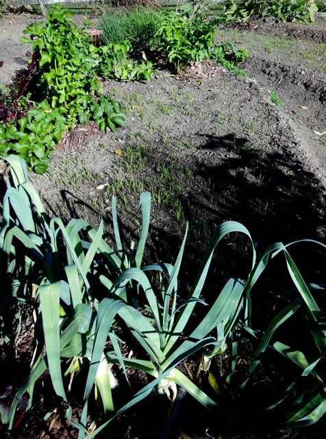 Until recently I would have yanked the crop plants, roots and all, and mixed the compost into the ground by turning over the whole top layer fork-deep. I had been oblivious of the community of hungry macro- and micro-organisms that, when fed and not disturbed, are at work in the soil aerating the ground, making nutrients available to plants, and further cultivating their relationships with each other and the roots of plants. My new practices are informed by no-till principles. Cutting off the stems of crop plants and leaving their roots in the ground provides food for soil biota. Spreading compost on the surface and inserting the tines of a spading fork or broadfork to introduce air and light into the earth avoids disrupting soil communities.