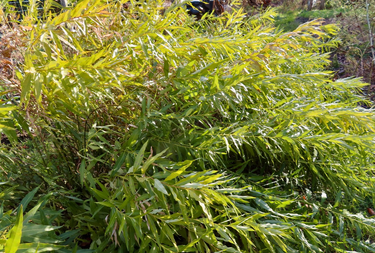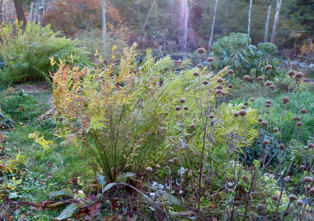 Amsonia (Amsonia tabernaemontana), eastern bluestar, is the standout perennial seen here as the last perennial to hold onto its leaves. See it in bloom here. Recently, as I walked by the plant, its leafy stems softly brushed my hand. A tender moment in the mostly dormant landscape.