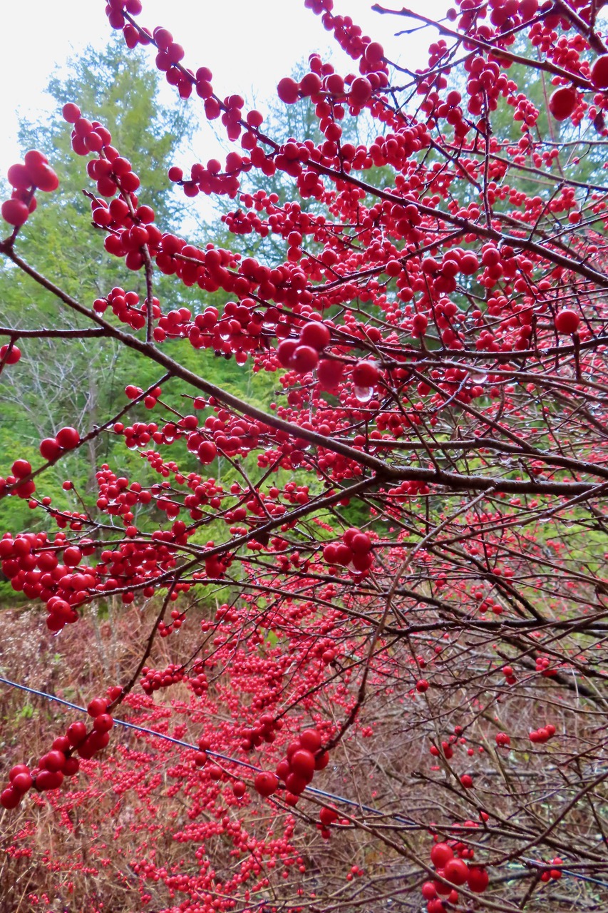 A scarlet magnet in the wintry landscape, this winterberry holly (Ilex verticillata) grew from a berry self-sown in my garden from a native shrub growing in the surrounding wetland. Many male and female winterberries inhabit the wet landscape. Notice the upright posts that frame the specimen shrub. I had constructed a pergola there, to grow grape and groundnut vines to shade a bench within. When I discovered the small tree that had chosen that spot, the new life prevailed. That was about 20 years ago. Find a pileated woodpecker in the winterberry bush here.