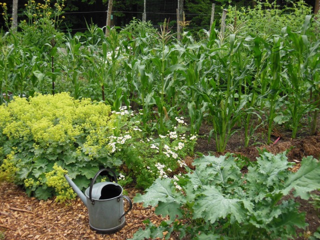 In April, prompted by the interest of a fellow plant adventurer, I reached for a quart jar of Painted Mountain corn kernels that I’d put in my cupboard about 10 years ago. I’d intended to grind the mix of ruby red, blue, violet, yellow, and white kernals into flour ages ago. I wasn’t optimistic about it as seed but he was, so I gave him half and dumped my half into a sprouting jar, thinking I’d eat it if it sprouted. When every kernel sprouted, I was overwhelmed with respect for the Montana farmer, Dave Christensen, who developed Painted Mountain. I couldn’t eat it. I had to plant the corn! But it was the end of April! I re-read Christensen’s description: