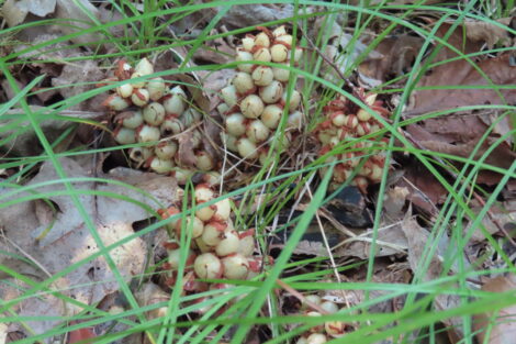 One of the most puzzling plants, American Bear-Corn, Conopholis americana, is parasitic, deriving its nutrients from the roots of oaks (Quercus). “How a plant?” It does none of its own photosynthesis. The photograph above captures cone-shaped yellowish flowers that turn brown and may persist all winter, appearing shriveled and black by spring. It is eaten by deer and bears, who serve as effective dispersers of the seeds. (Paraphrased from GoBotany, Native Plant Trust.)