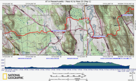 A mostly easy stretch of the Appalachian Trail in the Berkshires is traced by the red line between Route 41, map left, and Kellogg Road in Sheffield, to the right. In the middle, at the Sheffield Road marker, there is access to the trail going east and west, with parking. Double back to return or access a larger map for longer hikes.