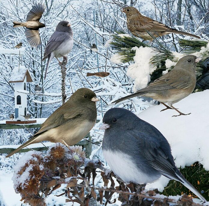 “In winter over much of the continent, flocks of Dark-eyed Juncos can be found around woodland edges and suburban yards, feeding on the ground, making ticking calls as they fly up into the bushes. East of the plains, the Dark-eyed Juncos are all gray and white. …” — Audubon