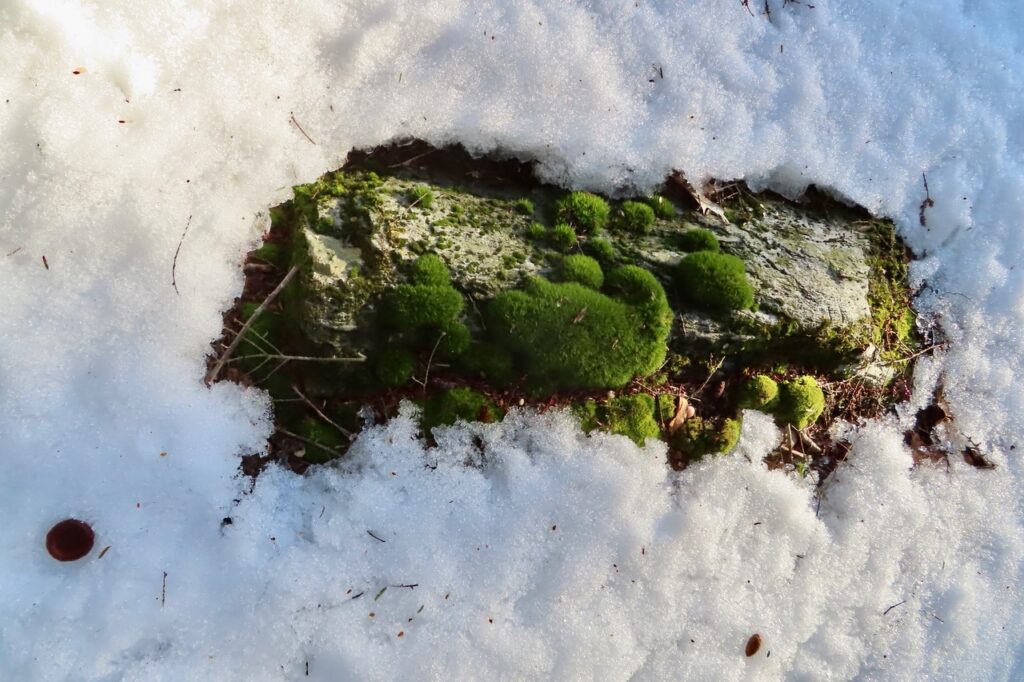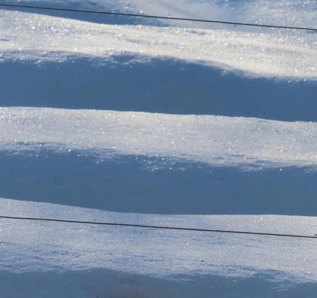 Snow reliefs and sculptural designs have appeared on and around the architecture of natural forms and human-made structures. See, here, deciduous twigs and evergreen needles meticulously painted with white brushstrokes. And, there, a standing, windswept wave on the hood of a car. Sunbeams elicit sparkle.