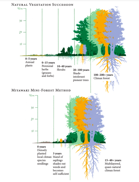 A soon-to-be-published book, born of the life’s work of Miyawaki, encourages us to participate in the forest’s life force and instructs us to plant small, complex forests — as distinguished from “planting trees” — in disturbed and vacant areas everywhere. Gracefully written by sustainability researcher Hannah Lewis, “Mini-Forest Revolution: Using the Miyawaki Method to Rapidly Rewild the World,” will be released by Chelsea Green in early June. The book is compelling especially for community leaders, parents, and educators who can initiate local and regional forest installations of any size or shape, preferably starting with the dimensions of a tennis court, or six parking spaces. Study this diagram, study a local forest, find direction in Hannah’s book and join the movement to contribute to the Earth’s health.