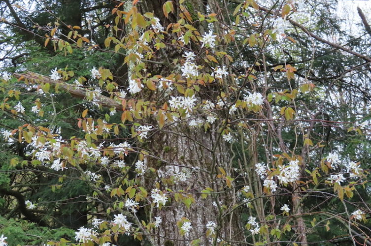 When hillside forests light up with soft white patches, we know where each amelanchier, Shadbush, is in full bloom, and that there are likely shad fish runs in New England rivers. When shadbush leaves appear, as shown in the photograph above, these exquisite understory trees — that grow to 60 feet — are beginning to set seed. At their best, small, rosy-colored Juneberry or Serviceberry fruits are delicious, as are the bony shad fish when smoked by local fishing communities. While Juneberry alludes to a calendar date, the Serviceberry moniker also associates the plant’s significance in marking the progress of the spring season. Serviceberries coincide with the return of services, e.g. transportation and visiting clergy, to backcountry locations.