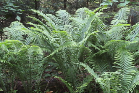 Red cardinal flowers (Lobelia cardinals) and blue lobelia, aka great lobelia (Lobelia syphilitica), are magnets for hummingbirds in sun to part shade. Referring to the top-of-page photograph, spotted Joe-Pye weed (Eutrochium maculatum), its deep pink umbels on stems reaching to 8 feet tall, is an insect feeder in sun and part shade. Dramatic ostrich ferns (Matteuccia struthiopteris) thrive in part-shade to shade. White turtleheads (Chelone glabra) are found in sunny locations but prefer part shade.