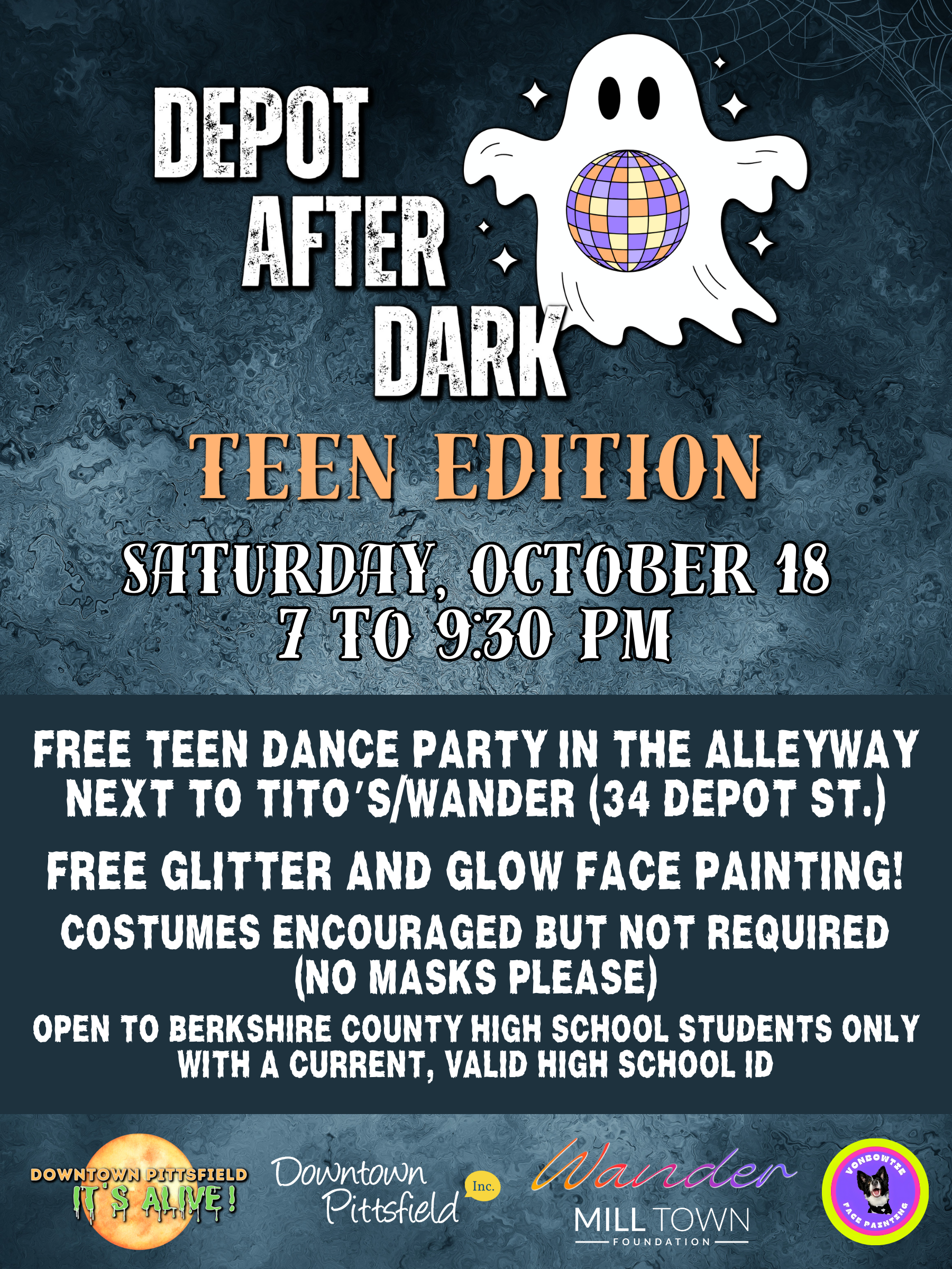 Liberty Street Liberty Street, Pittsfield, MA, United StatesDepot After Dark: Teen Dance Party Edition! will be held on Saturday, October 18, 7 to 9:30 pm, on Liberty Street (the alleyway between Tito’s/Wander and Crawford Square). Depot After Dark: Teen Dance Party Edition! is open to Berkshire County high school students only, and attendees must have a current, valid high school ID. This […]