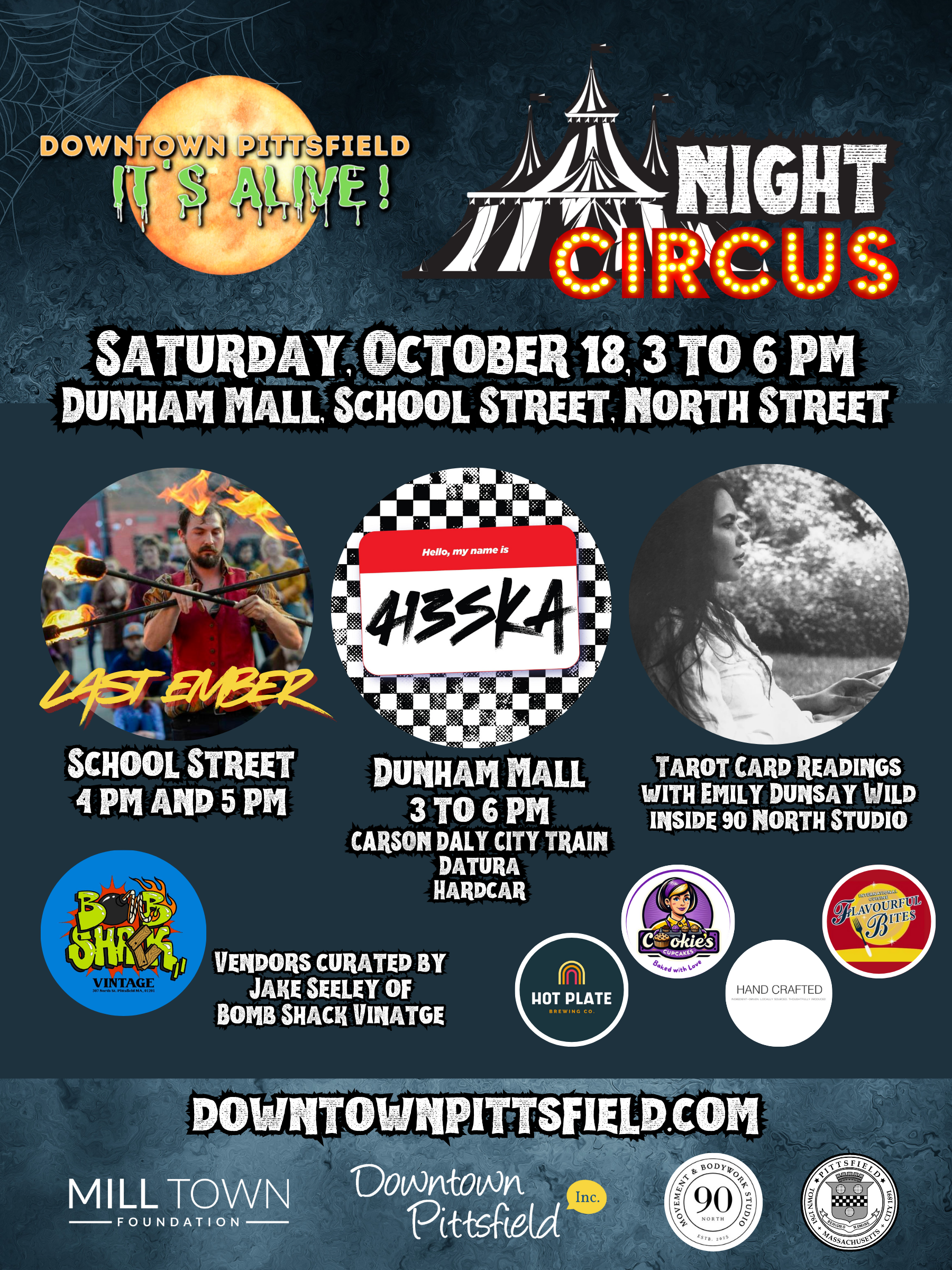 Dunham Mall 100 North Street, Pittsfield, MA, United StatesDowntown Pittsfield… It’s Alive! Night Circus: Saturday, October 18, 3 to 6 pm, on Dunham Mall, School Street, and the portion of North Street that connects the two. The Downtown Pittsfield… It’s Alive! Night Circus will feature live ska and punk rock bands presented by 413ska; a fire show with Last Ember; free Tarot Readings […]