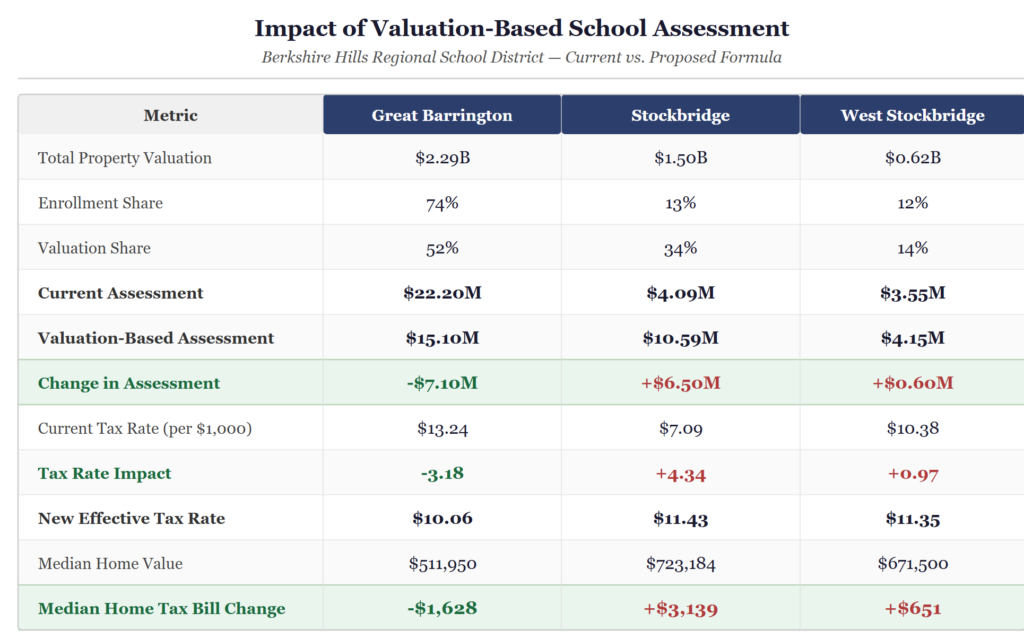 The impact for Great Barrington would be transformative. Under a valuation-based formula, the town’s school assessment would fall by more than $7.1 million per year. The tax rate would drop from $13.24 to roughly $10.06 per thousand dollars of assessed value, saving the owner of the median home approximately $1,628 annually.