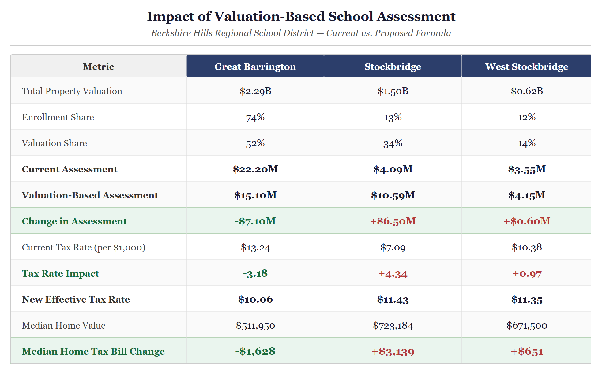 The impact for Great Barrington would be transformative. Under a valuation-based formula, the town’s school assessment would fall by more than $7.1 million per year. The tax rate would drop from $13.24 to roughly $10.06 per thousand dollars of assessed value, saving the owner of the median home approximately $1,628 annually.