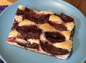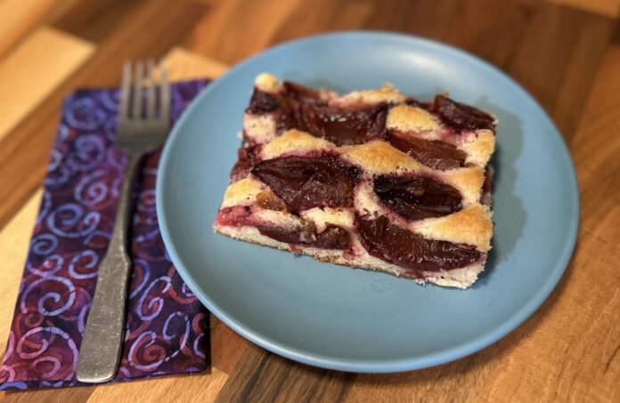 New Lebanon— When I first met my husband’s mother, I was soon introduced to her famous Pflaumenkuchen, which is a plum cake. This recipe was from her mother who was from Germany. My husband grew up enjoying many German recipes, and I keep the memories of his mother and grandmother’s cooking alive by making them for him throughout the year. I make Pflaumenkuchen in the early fall when autumn plums, also known as Italian prune plums or blue plums, are in season. We usually eat it on its own, but for special occasions, it’s delicious with vanilla ice cream or freshly whipped cream.