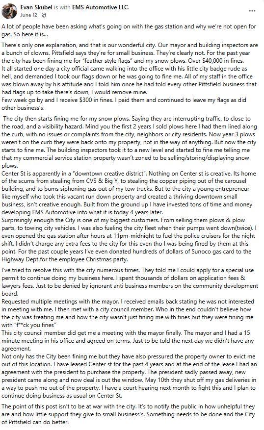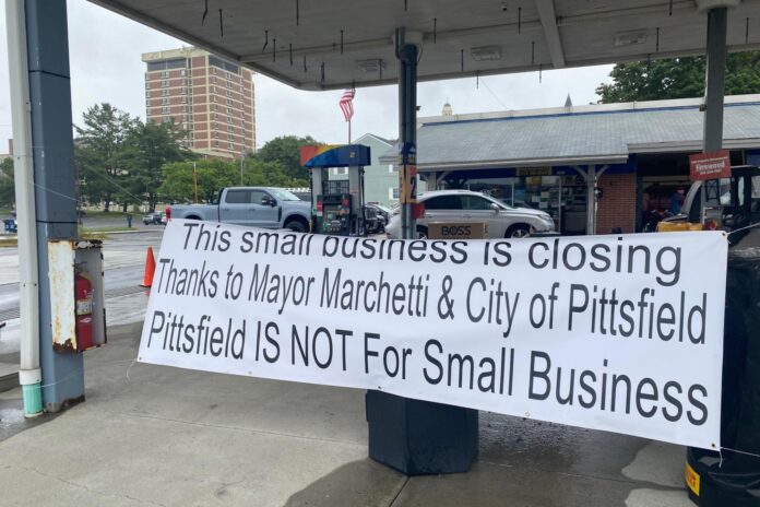 Pittsfield — A sign hangs on the front of EMS Automotive, located at 51 Center Street, that reads, “This small business is closing thanks to Mayor [Peter] Marchetti and the city of Pittsfield. Pittsfield IS NOT for small business.” The sign is the latest in the battle between EMS Automotive owner Evan Skubel and the city over multiple zoning code issues.