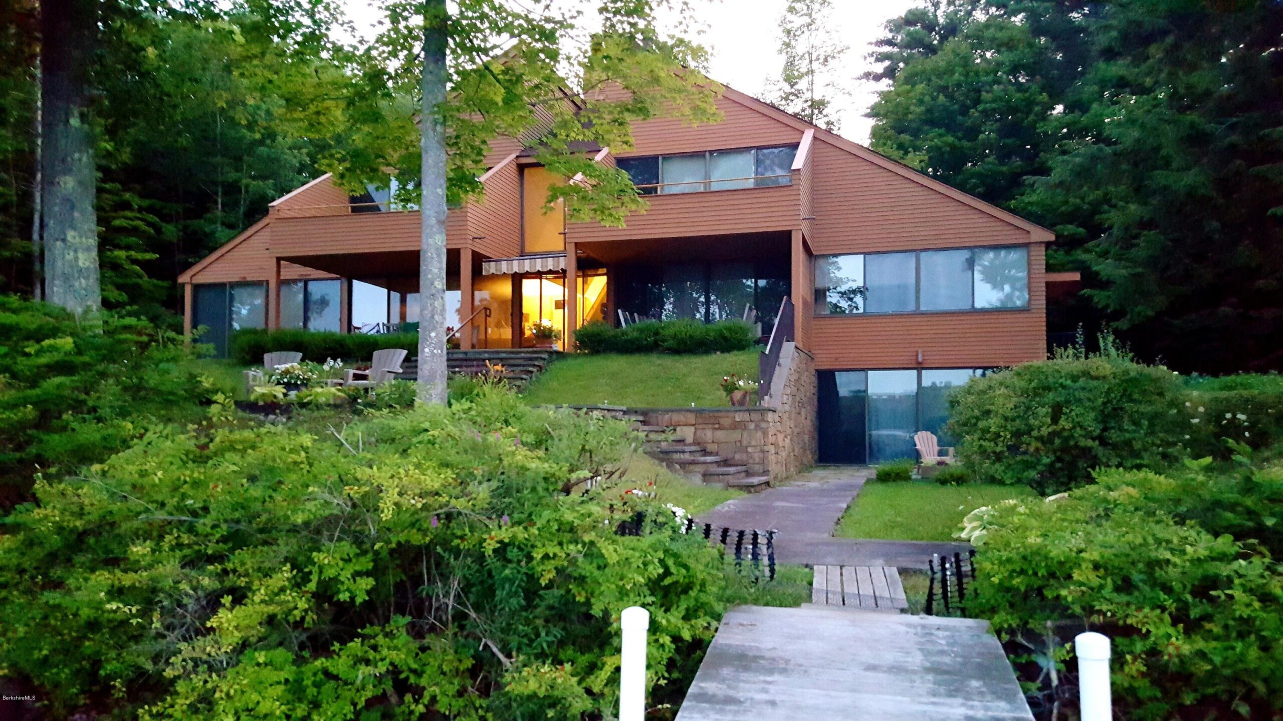 Tranquility reigns in this stunning setting on Stockbridge Bowl, where a spectacular, modern lakefront retreat, designed by award-winning architect R.J. McDonald for himself, affords the quintessential Berkshire lifestyle, replete with unparalleled lake access and stunning views. On 4.92 acres encompassing lawns, woods and stream, on land once part of the Astor estate, its roofed terrace and lakefront patio are a mere 30-50′ from the shoreline. Framing ever changing lake vistas, floor-to-ceiling windows grace major rooms, while a first-floor open plan, five bedrooms, two fireplaces, and high quality details embody the finest design and construction. The large dock invites one to canoe, kayak, swim, or fish, and offers an ideal spot to watch Tanglewood’s July and August fireworks. Perfect!
