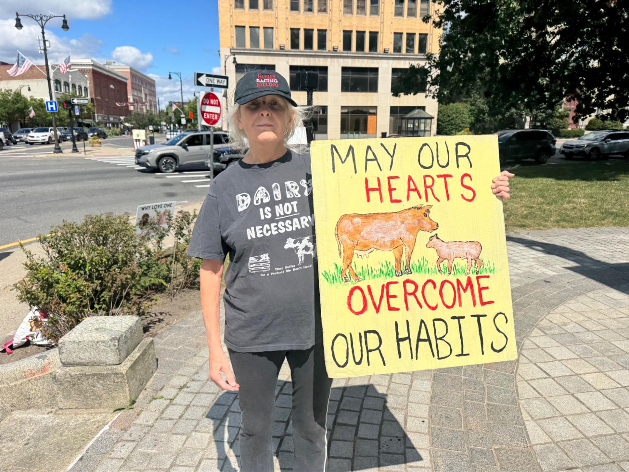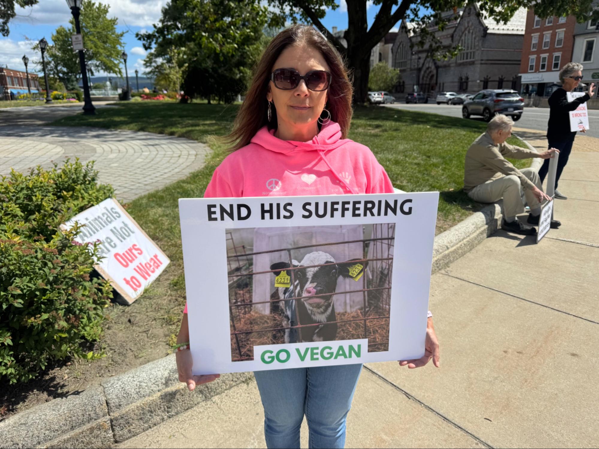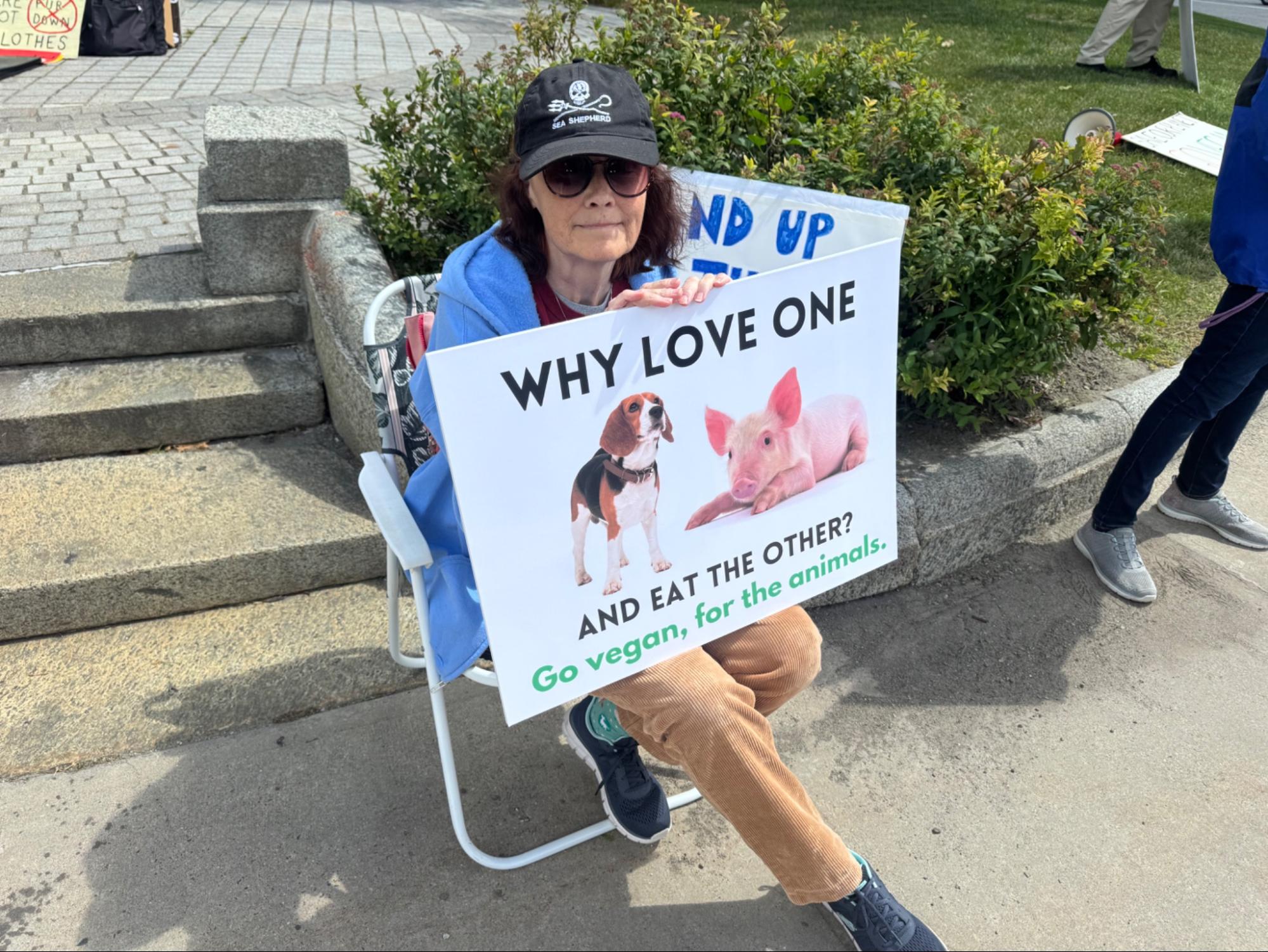 Jean Daniels, who has been vegan for 41 years and fighting for animal rights for just about as long, said that she does not let the negative feedback get to her. She sees veganism as a “win, win, win” solution: It is good for the planet, good for our bodies, and we can feed more people that way. In her late 70s, Daniels says that she has “not much more time, but still some energy.” And she was using that energy by being out there on Saturday.