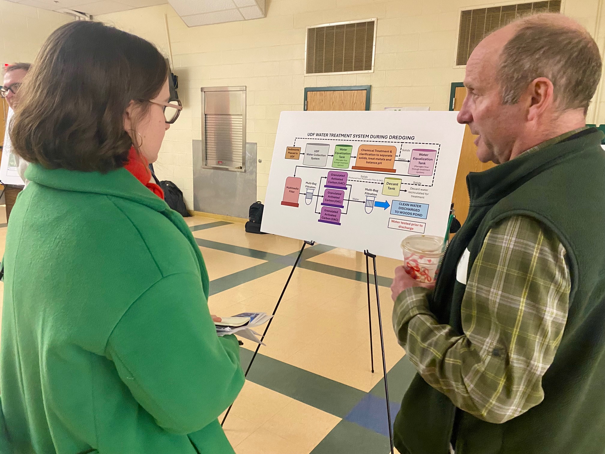 Residents David Carrington and Caroline Young were “interested in the outcome” of the remediation project, Carrington said, and oppose its dewatering component. They advocated for a different plan to remove the PCBs from Woods Pond, one that would not involve water extraction, allowing the UDF site to serve the community as a science and nature park. “We have the ideal solution to eliminate the [UDF] dump, which is of no value, zero value to the Berkshires,” Carrington said. He and Young promoted a project that would drain Woods Pond and use excavators to scoop the toxic material out, removing it from the area.