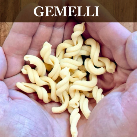 What have we here … ah, “gemelli,” which means “twins.” The “g” here is also soft, because it’s followed by an “e.” It’s pronounced in Italian just as we’d say it in English. “G” followed by “a” or “o” or “u” is hard, as in “gamba” (leg), “gomito” (elbow) and “Gubbio” (cute town in Umbria.)