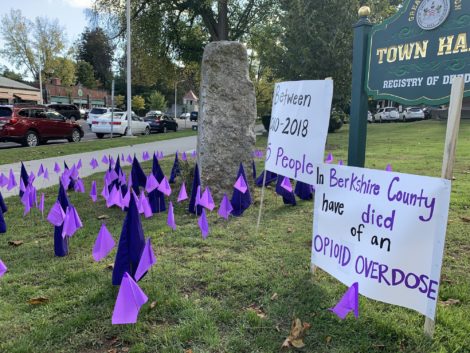 The trio was busy in front of town hall planting 215 flags — the same number of people who died of opioid addiction in Berkshire County between 2010 and 2018, according to the Bureau of Substance Addiction of the state Department of Health.