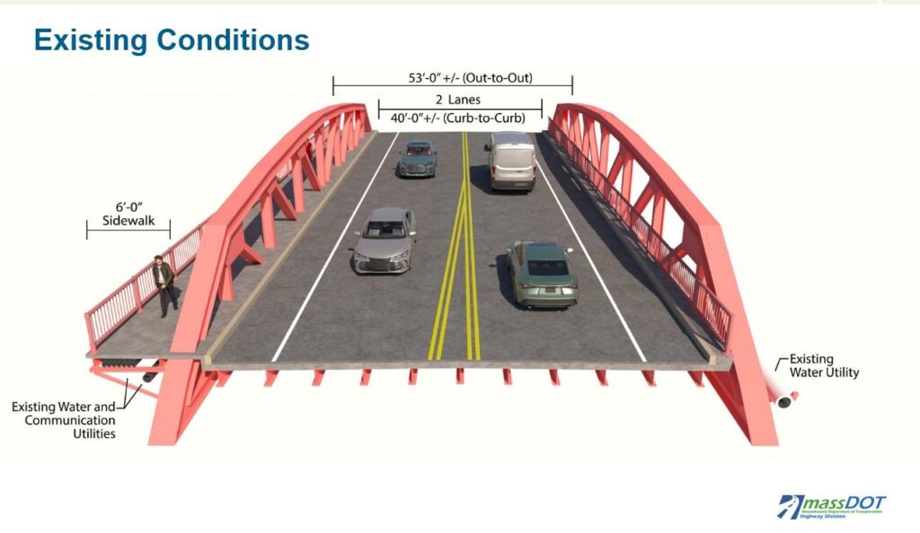 A report from MassDOT lists that the bridge “lacks the necessary width to adequately accommodate existing traffic volumes, further compounded by its limited load-carrying capacity.”