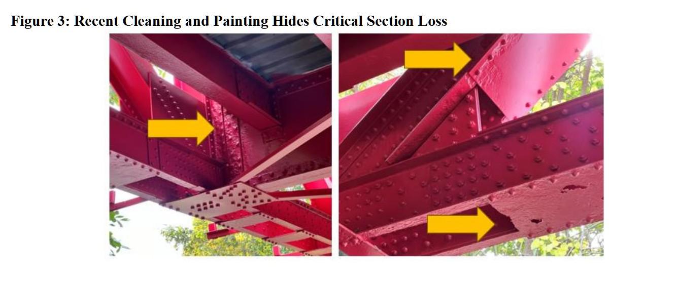 [The bridge’s] foundations include masonry elements of an earlier crossing for which there are no records. The trusses which hold up the bridge have no protection from accidental vehicle impacts.
