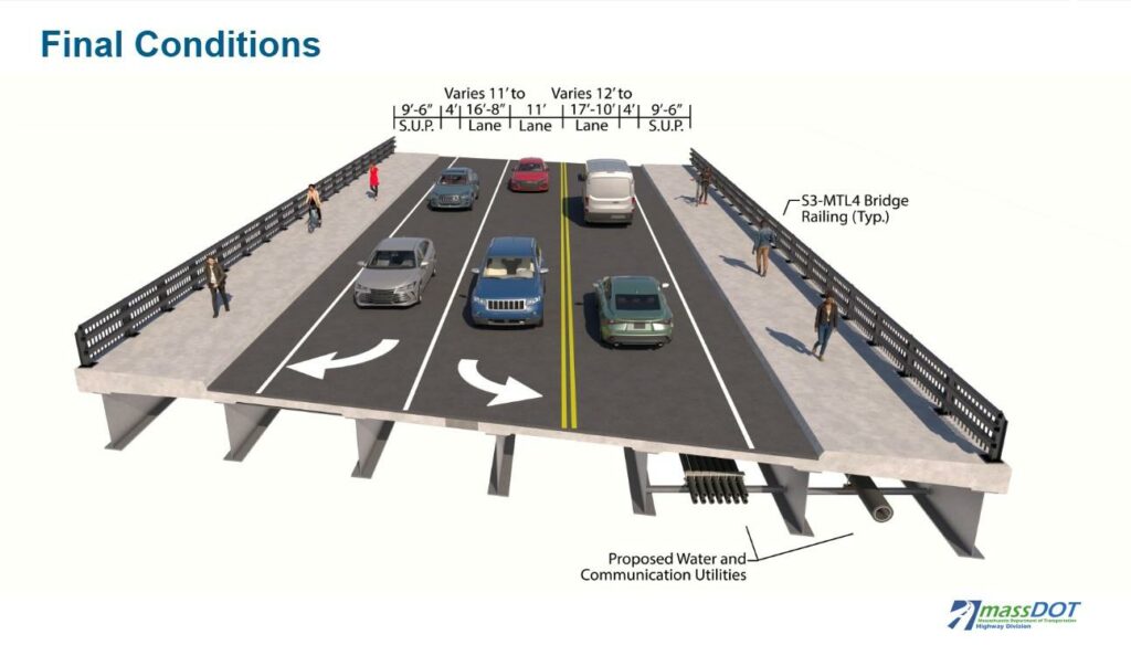 According to MassDOT’s plans, the new bridge will include dedicated left- and right-turn lanes for the westbound approach of State Road to relieve peak-hour traffic congestion. Additionally, the western end of the span would be wider than the eastern end in order to accommodate turning trucks.