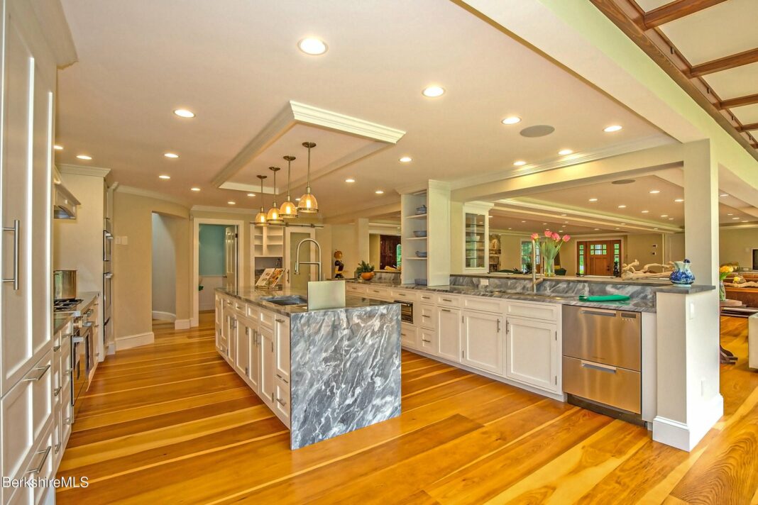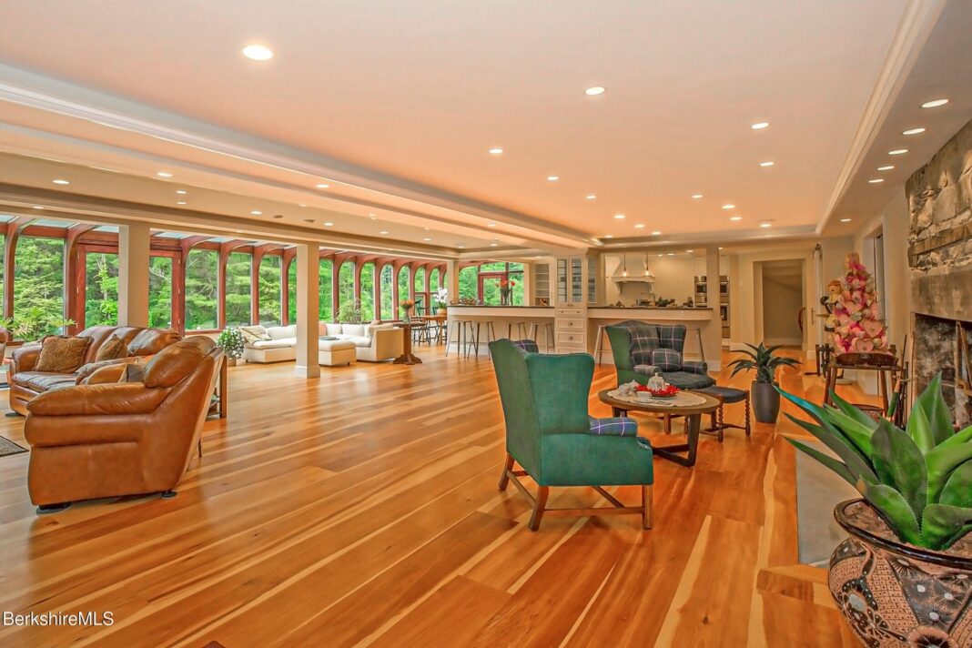 The renovation of this 1930’s Cape Cod by a master craftsman and his designer wife into the stunning modern-day Contemporary it is today, while preserving some of the original highlights, is nothing short of a design miracle. The immense Great Room with the 60-foot wall of glass overlooking the terraced stone wall that leads to a stream and pine forest is the focal point of this special home. The exquisite chef’s kitchen with 3 islands, marble counters, high end appliances with both a coffee and wine center is in full sight of the floor to ceiling fireplace, and numerous seating arrangements. From the built-in sound system, to the central vac, full house generator, hydrotherapy massage tub in the primary suite, dual head shower and four fireplaces, or the waterfall in the dining room, every inch of the house is a pleasant surprise and we invite you to call and make an appointment to view this special property in its most convenient location on the outskirts of the wonderful Village of West Stockbridge.