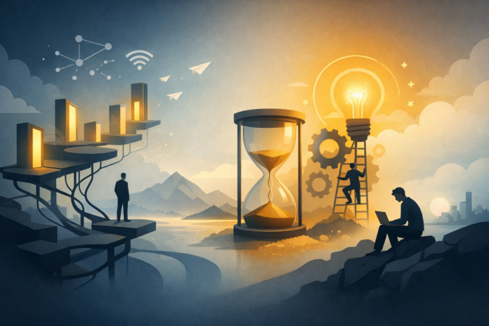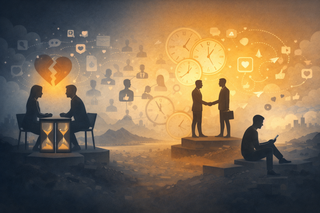 In engineering, a time constant describes how quickly a system responds and resets. A short time constant means fast response, fast decay. The platforms restructuring human relationships, dating apps, gig work, remote-first contract culture, and the relentless churn of social media are all short-term constant systems. The problem is that the software running inside us—attachment, trust, love, creative collaboration—evolved over millennia to operate on long time constants. We are running long-duration processes on short-cycle hardware and wondering why nothing accumulates.