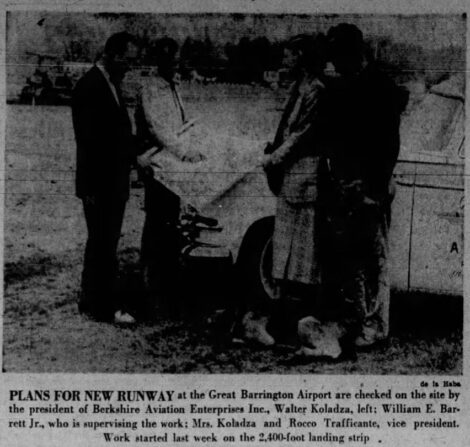 There were other financial connections between the runway project, the town, and business and municipal leaders. According to the Recorder’s detailed profile of the airport, Koladza said the total cost of the new runway was around $15,000, or more than $160,000 in today’s dollars, and revealed that some amount was paid to the Town of Great Barrington—but not to cover fees typically associated with building permits. Instead, money changed hands so the airport and Barrett’s construction firm could use town-owned heavy-construction equipment to build the half-mile runway, the Recorder reported. But there’s no mention in local news coverage of town government in 1957 that details that arrangement—in those days, every selectmen’s meeting was covered in detail. Today, according to town officials, the Selectboard’s minutes from 1957 are missing, so they can’t be reviewed for any discussion among board members or the amount of income to the town.