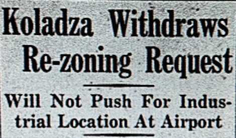 And that was it. Koladza withdrew his proposal, citing his neighbor’s opposition. “Because my neighbors are up in arms and because I would prefer not to sell the airport, I am withdrawing the airport from consideration for industrial development” he said, suggesting that sale of the entire property to the unknown firm may have been his plan. “I’m disappointed that my neighbors thought I would do something to despoil the area,” he added.