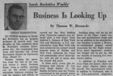 Tom Bleezarde, a reporter who had long covered the airport, followed up with a column titled, “Business Is Looking Up,” detailing the airport’s continued growth. “No other business in Southern Berkshire has as graphic evidence of growth over two decades as that exhibited daily by Berkshire Aviation Enterprises,” he started out. He chronicled the airport’s history and the “true visionaries” at its helm since its founding and reported that the flight school had seen 40 percent growth over the prior year.