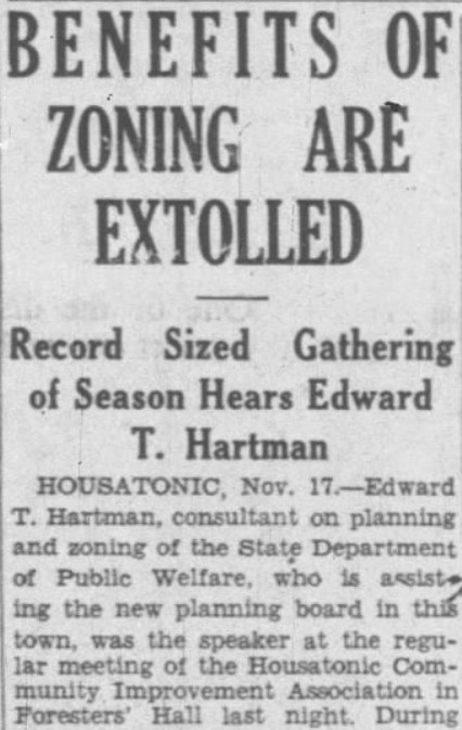 In November 1931, as Great Barrington’s permanent bylaw neared completion, Hartman was the featured speaker at what the Eagle described as the “record-sized gathering of the season,” organized by the Housatonic Community Improvement Association. In front of a packed crowd of perhaps 200 people in Housatonic’s Forester’s Hall, he again argued that zoning “is as important for the working man as for the wealthy,” from those employed in real estate, insurance, and banking to the “plasterers and others [in] all trades” who would benefit from its protections.