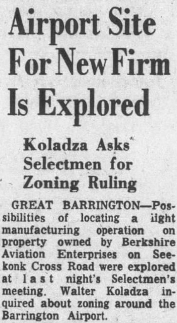 Just as in 1950, one day in April 1964, Koladza appeared before the selectmen with startling news and an urgent request. The Eagle reported on his appearance under the headline, “Airport Site for New Firm is Explored; Koladza Asks Selectmen for Zoning Ruling.”