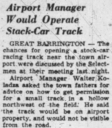He also assured the selectmen that airport neighbors were on board with his plan. Well, at least one: According to the Berkshire Courier newspaper, “[Koladza said] he inquired of his nearest neighbor if he had any objections if a track were established and said his neighbor told him he did not.”