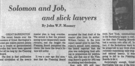 In 1972, as the town continued to struggle with conflicts created by growth and the arrival of well-heeled developers, he published an op-ed criticizing the 1960 bylaw and those who sought to subvert it. “It is perhaps one of the clumsiest bylaws ever devised,” he wrote in the Eagle, “requiring the wisdom of Solomon and the patience of Job to enforce, and only the shrewdness of a slick layer to subvert.” Having served on town boards as well as covered its members as a journalist—often quite critically—Mooney didn’t stop there. “Since slick lawyers are far more common at zoning hearings than Solomon and Job, the results are predictable,” he argued.