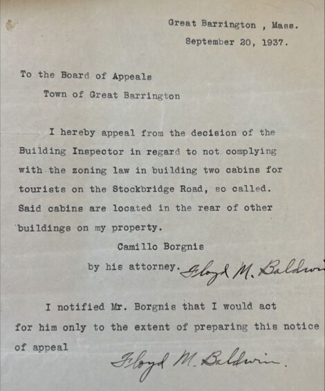 That the new ZBA was born in a different era is clear from its third-ever meeting, held in late 1937. That is when Camillo Borgnis, a nascent hotelier who immigrated to the Berkshires from Italy in 1913, appealed a zoning violation related to those tourist cabins built on his Stockbridge Road property. His appeal was filed by a local attorney, Floyd M. Baldwin—who, oddly enough, happened to be chairman of the ZBA. “I notified Mr. Borgnis that I would act for him only to the extent of preparing this notice of appeal,” Baldwin added helpfully at the bottom of a letter sent to his fellow board members. The ZBA voted unanimously to let the cabins remain.