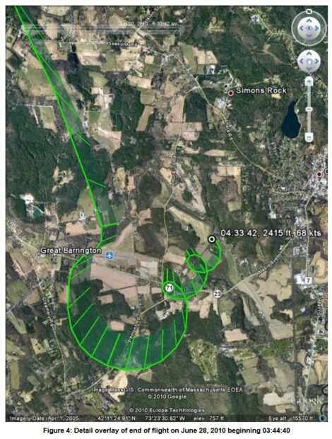 Over the last 30 years, the most serious accidents connected to the airport, including those that resulted in fatalities, occurred near the airport and close to houses. (Two fatal 1990 accidents are described in part six of this series.) In June 2010, a 20-year-old, instrument-rated local pilot with 550 hours of experience, and flying a BAE plane, crashed after losing his bearings while trying to land at GBR in heavy fog after midnight. The NTSB’s reconstruction of the flight’s final moments using its GPS data showed the plane was in a descending spiral over nearby homes while the pilot thought he was on final approach for landing. The pilot and his passenger were both injured.
