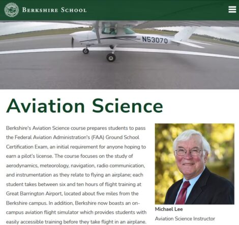 That total doesn’t include half a dozen or so from Sheffield’s private Berkshire School who take lessons on Sunday mornings during their spring semester. That flight training is underwritten by The Hans Carstensen Aviation Endowment, named for a Berkshire School alumnus, according to Michael Lee, a local pilot and educator who helped re-establish the school’s aviation-science program in 2010. There are no comparable programs currently offered by Berkshire County’s public high schools.