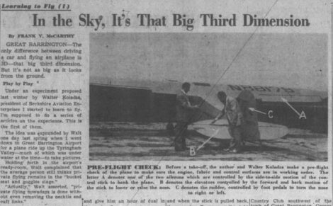 One Eagle reporter, Frank V. McCarthy, took flying lessons at GBR in 1953 and wrote an extensive five-part series about the experience. In the first installment, he explained how the project came to be: “Newspapers should enlighten the public about the ease and safety of flying a small plane,” Koladza reportedly told him during a visit to the airport. “And the best way to do that would be to take an ordinary newspaper reporter who had never flown in his life, teach him to fly and have him do a series of articles on it.” McCarthy eagerly took the bait, boasting in print that he was “getting $250 worth of flying lessons for nothing.” (DISCLOSURE: The Berkshire Edge paid for my $99.00 introductory flight lesson.)